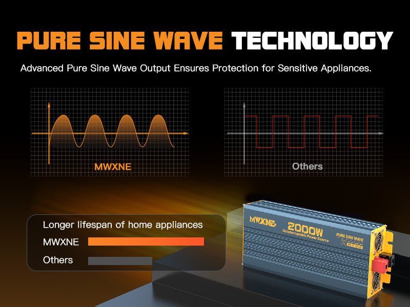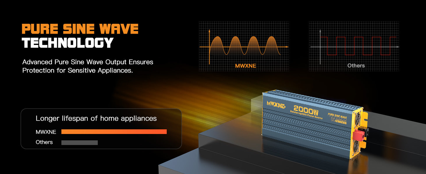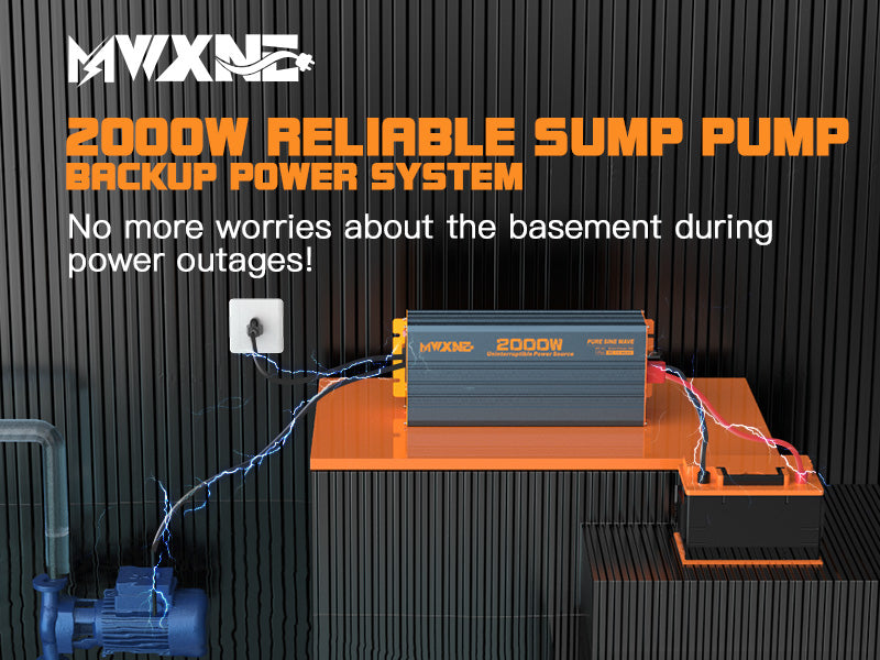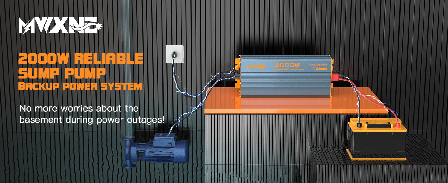 【EXCELLENT PERFORMANCE】 The battery backup for sump pump delivers a power output of up to 2000W and a current output of up to 18.5A, effortlessly supporting single and dual pump systems. MWXNE efficient backup inverter generates a stable pure sine wave 120 VAC waveform, ensuring a clean power source equivalent to grid power, preventing damage to electrical appliances.