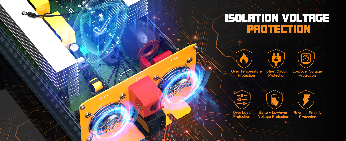 | Protection Function(s) | Battery under-voltage protection, over-voltage protection, output overload protection, over temperature protection, short-circuit protection, reverse polarity protection, and so on. | ||