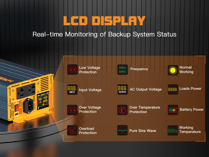| Display Content(s) | Input voltage, Output voltage, Load power, Battery Capacity, Frequency, Internal temperature, Overload protection status, Over-temperature protection status, Under-voltage protection status, Over-voltage protection status |