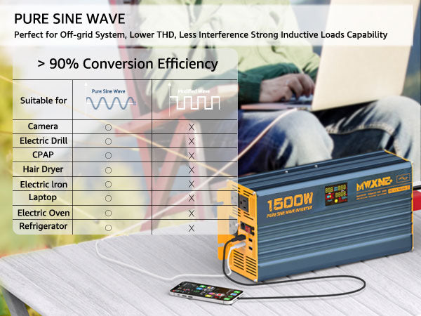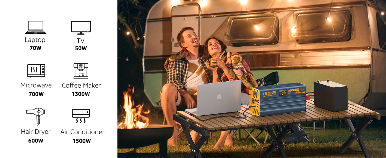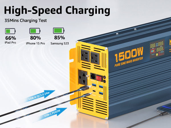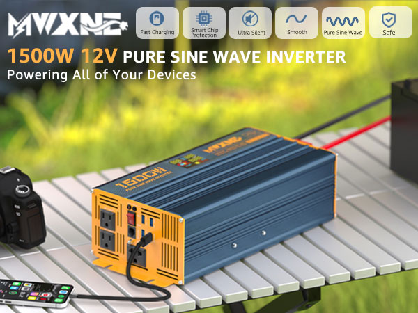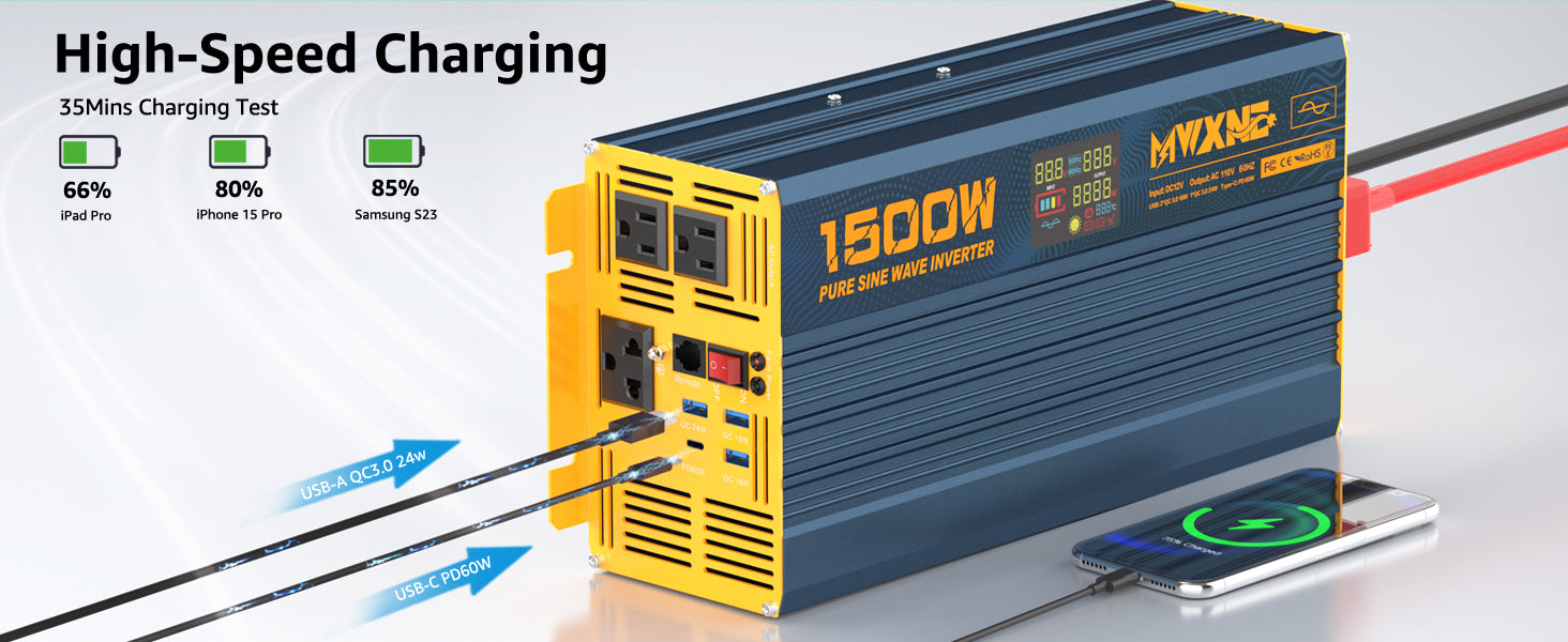 【FAST CHARGING USB PORTS】MWXNE Upgrade fully 1500 Watt Power Inverter converts 12V DC to 110V/120V AC with 3 AC outlets, 2 18W USB-A ports, a 24W USB-A port and 60W USB-C (TYPE-C) PD port for fast charging. 4 USB ports can power multiple devices at the same time. It is convenient for you to use in various environments and share with your family and friends.