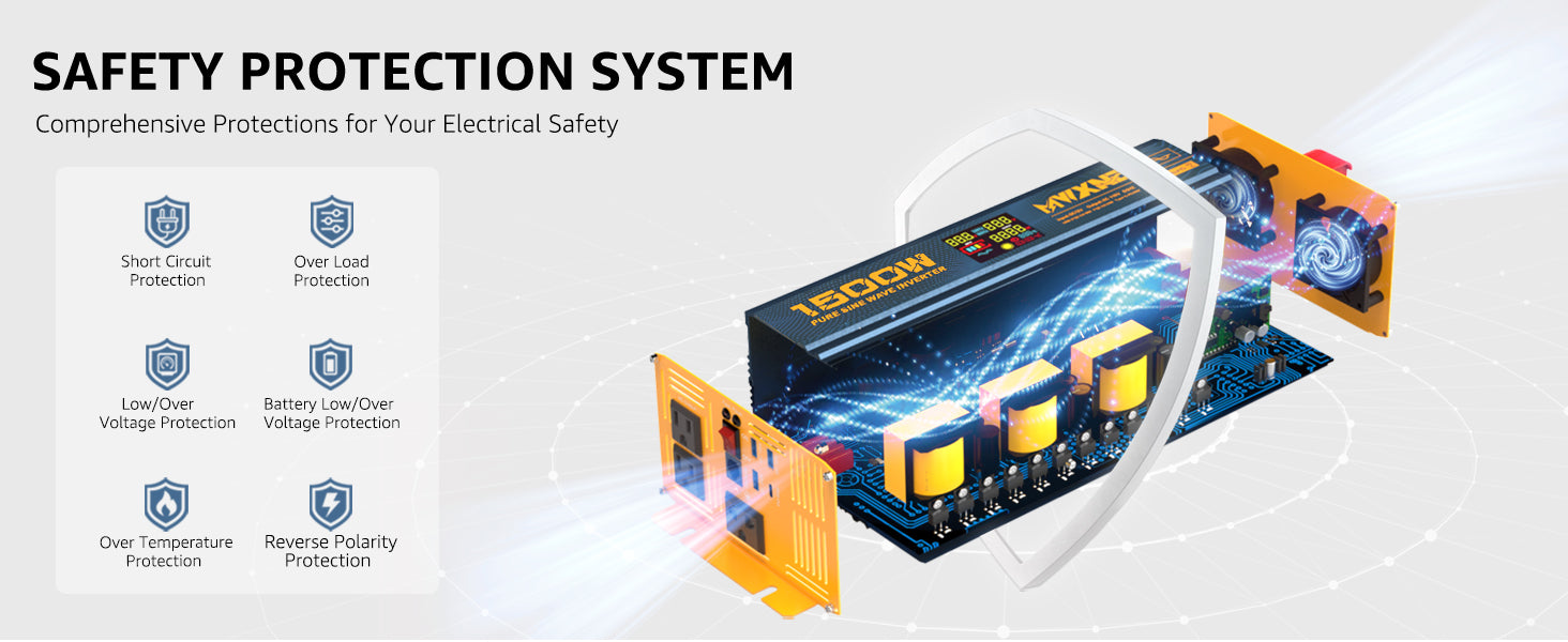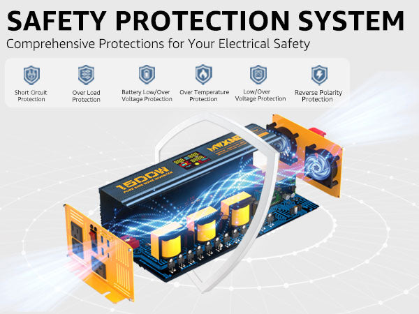 【FULLY SAFETY PROTECTIONS】 The pure sine wave inverter has passed FCC CE ROHS PSE certification. Designed with isolated input/output stable design offers under-voltage protection, overvoltage protection, overload protection, overheating protection, and short circuit protection to ensure safety.