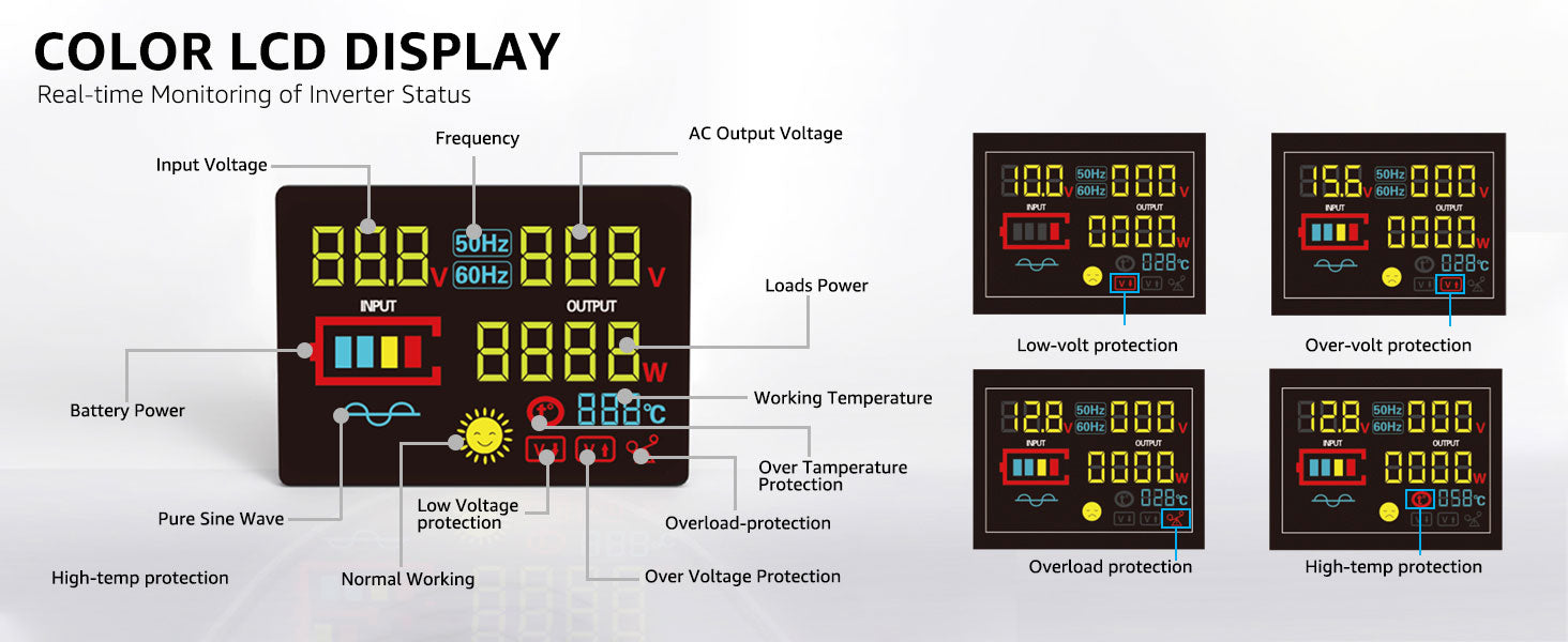 【INTELLIGENT LCD DISPLAY SCREEN】This inverter features a bright LCD display that can show your voltage, protection status, frequency and so on. Allows you to easily identify the current operation status and alert messages.